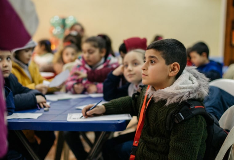 Los niños acaban de comenzar sus actividades al aire libre en el Centro de Esperanza tras haber tenido una fiesta navideña. Entre ellos está Apo, un joven adolescente de Alepo.